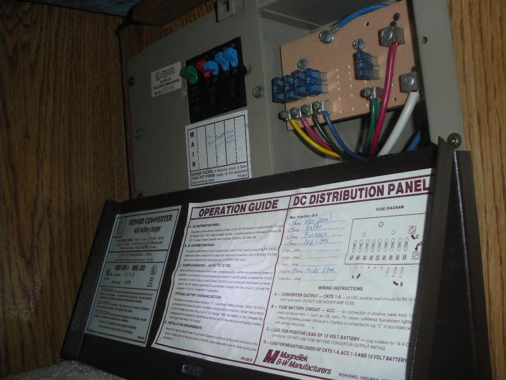 これは、同じくダイネットのシートの下にある POWER CONVERTER With Battery Charger ですが、例の赤いスウィッチの右隣の青いスウィッチが・・Refridg じゃ無くて Receipt と名付けられている・・ON でも OFF でも無くて中間で止まってます。上に押しても下に押しても中間に戻って来ます。他のスウィッチは、家庭のブレーカーと同じで下にある場合は押し上げて、異常が無ければ上で止まります。