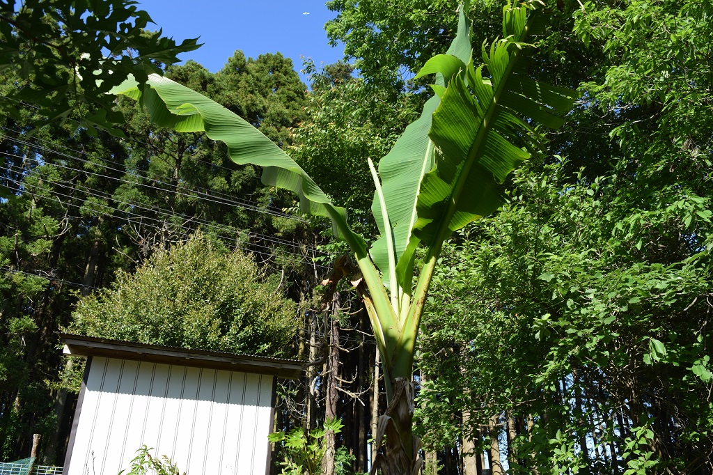 最大級に大きな葉の太い芯、葉脈?が茎を兼ねる。球根で吾家に来て三年目?・・今年は大きくなりそうだ。バナナ(芭蕉)。